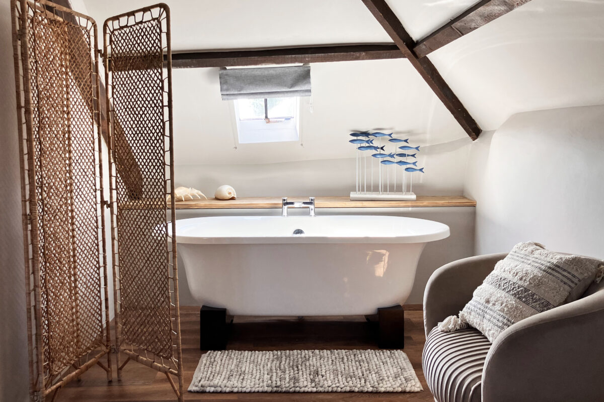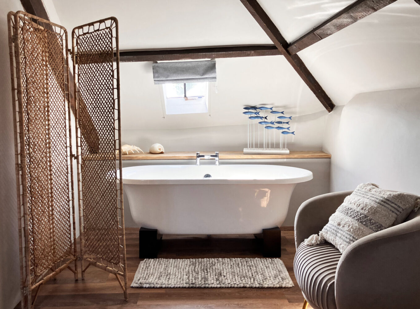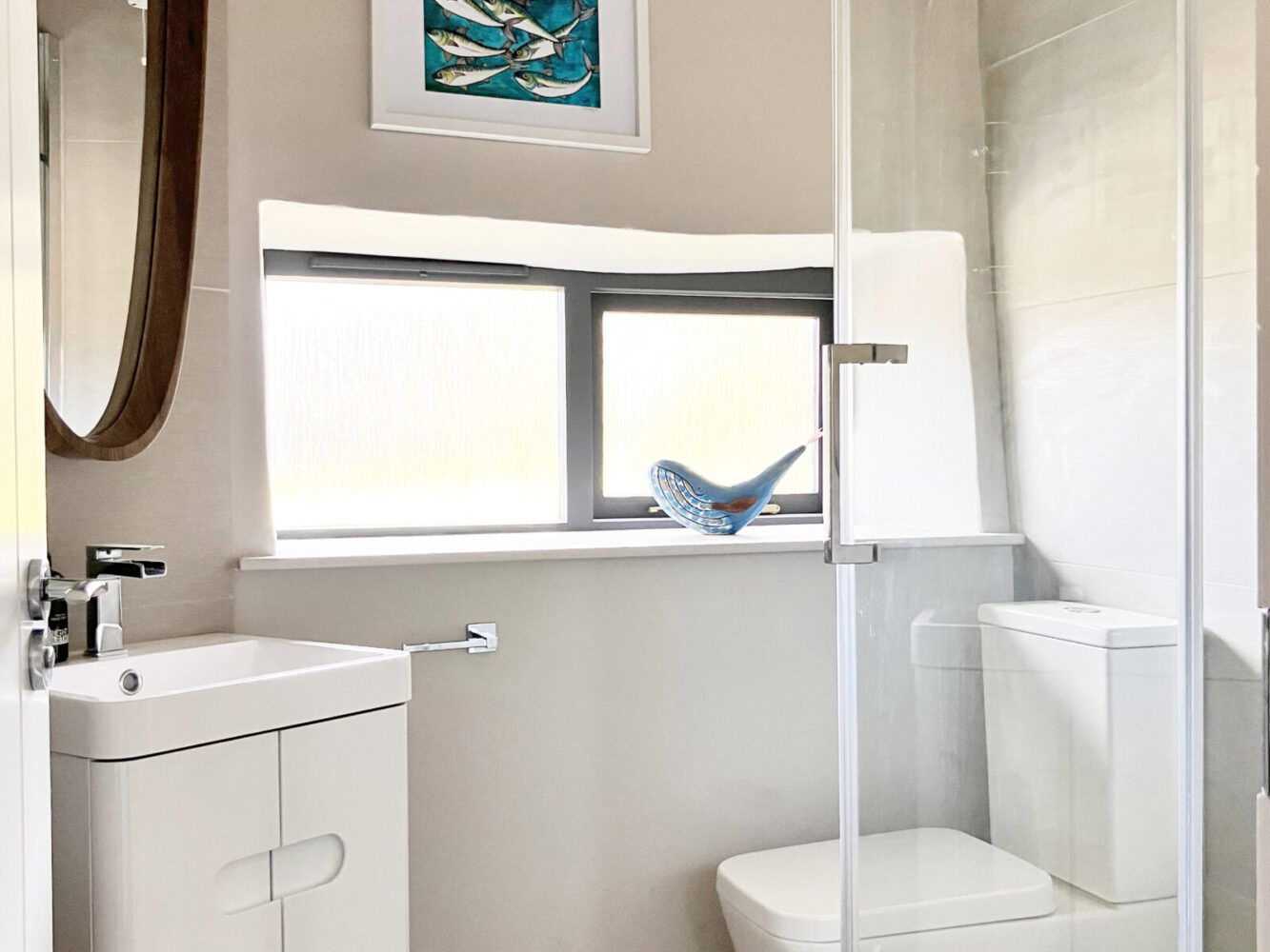 Originally the stables for Marsland Manor Farm, Hunters Lodge offers elegant newly renovated accommodation spread interestingly across three floors. The ground floor features a large kitchen/dinner including a snug area with sofa and triple-aspect windows that allow in plenty of natural light in, the hub of the property. Off of the kitchen a separate utility room housing a washing machine and tumble dryer plus sink and clothes airer. A spacious sitting room can be found on the ground floor which has high a lofted ceiling, a modern log burner, French doors leading into the garden and a even a glimpse of the Celtic Sea. Adjacent to the sitting room is the large principal bedroom, a feature bath sits freestanding in the alcove at the foot of a luxurious kingsize bed plus private en suite. The first floor houses two additional bedrooms, one of which is en suite, along with a family bathroom. On the lower ground floor, there are two more bedrooms and a shower room. The lodge boasts a private garden with a manicured lawn, bordered by mature trees and shrubs for added privacy, and includes a small terrace area perfect for al fresco dining in the traditional Japanese Kamado barbecue.