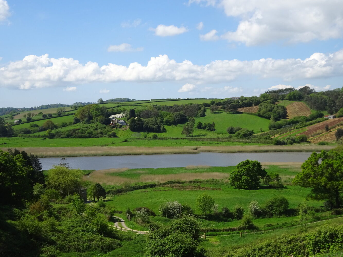 Keep straight on up an ascending rough tarmac track; pause to look back across the valley and downstream along the river. Areas of riverside land on the Cornish side, enclosed in the 19th century, are now being allowed to flood, as at Cotehele. The views are stunning! An apple orchard is passed on the approach to Helston Farm; ascend between farm buildings and follow the drive up to meet a lane.
