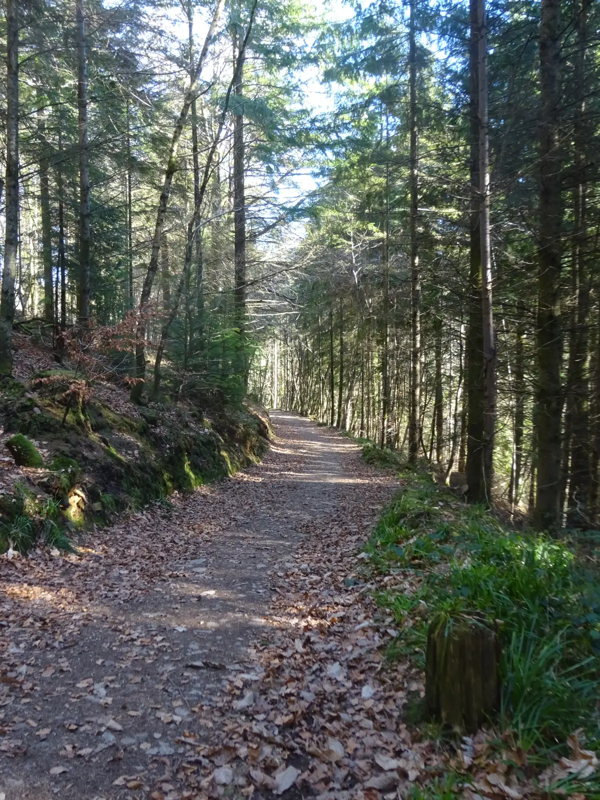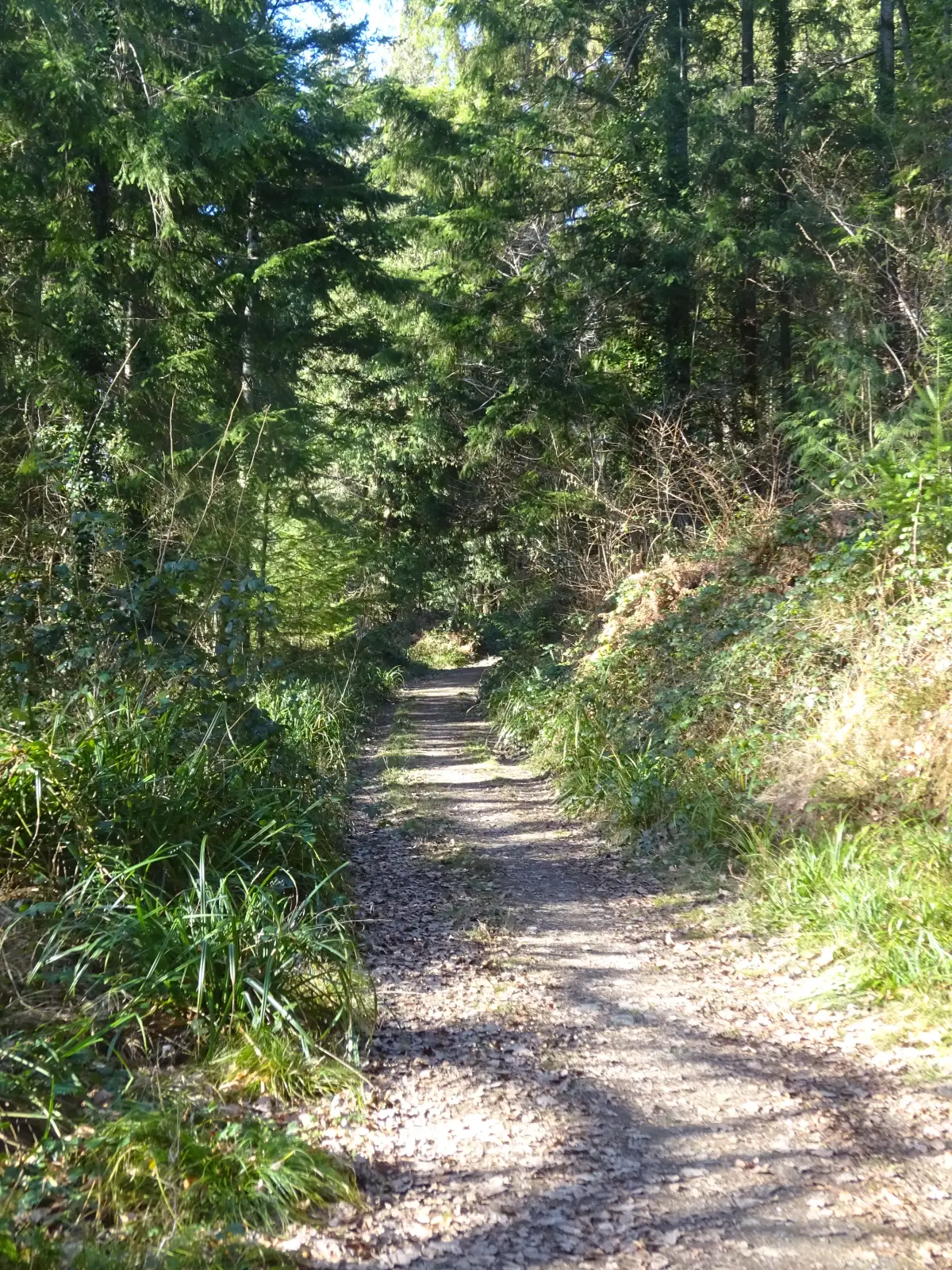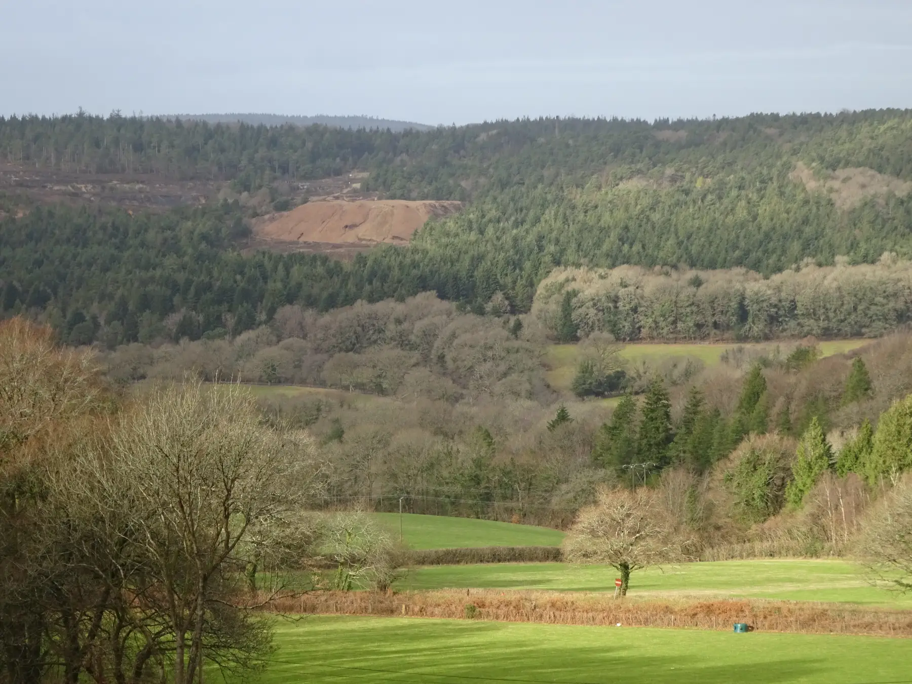 Cross with care – the road is straight and cars move pretty fast along it. On the other side look back to see the timber yard that now stands on the levelled spoil heaps of the Bedford United Mine. Wind between walls, crossing the railway line (you can see the old railway bridge in the cutting below), then follow the trackbed along an embankment, with lovely views, and into Hatch Wood. Keep ahead at a path crossroads, then pass a track (right) to South Bedford car park. The track continues through soaring conifers, soon running along on the edge of the vertiginous valley side – in winter you may catch glimpses of the river and houses in Hatches Green far, far below. Eventually the track bears left, and descends into a small combe to reach a path junction.