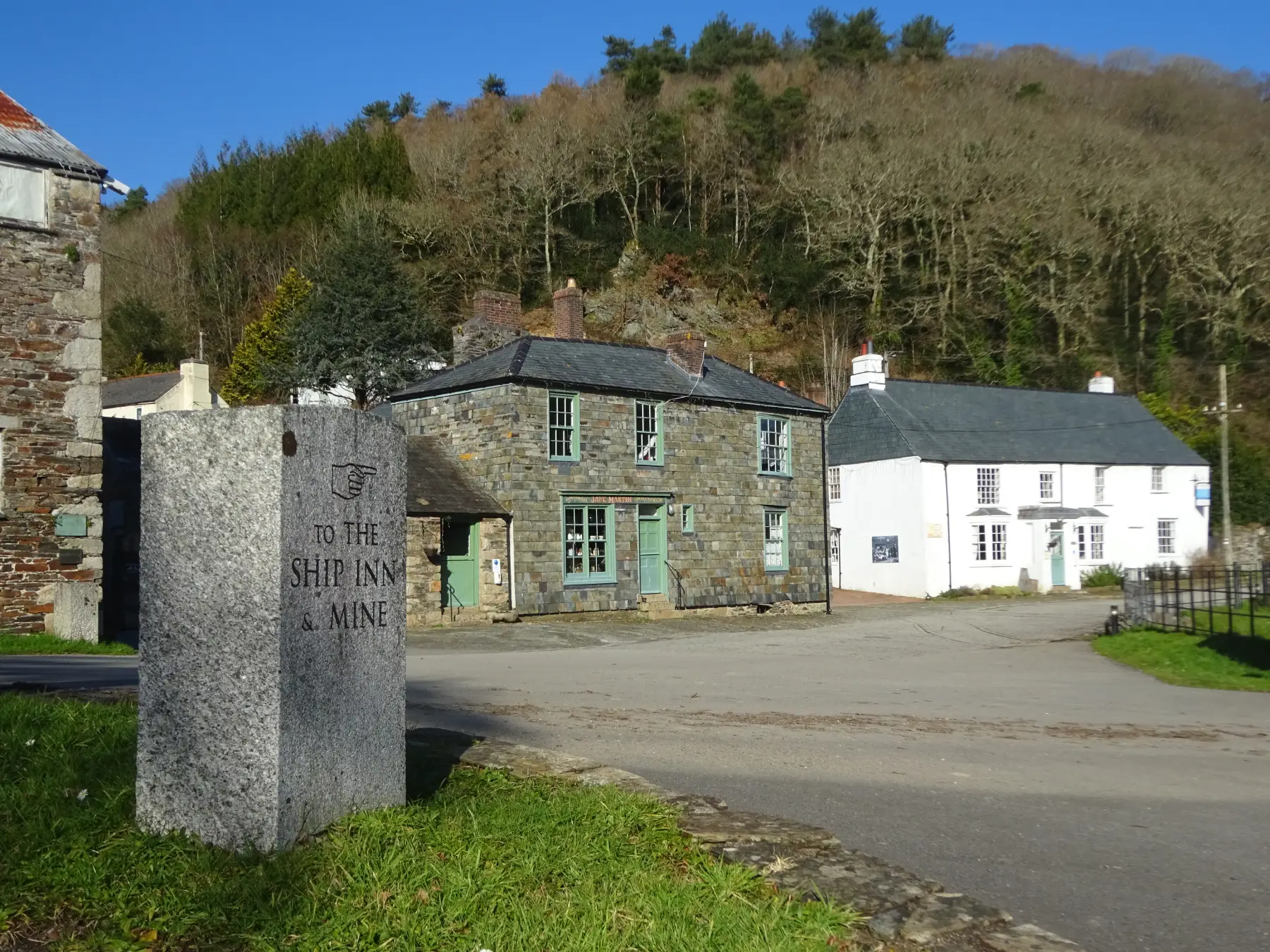 Turn right, towards Morwellham. The track runs through fields: over a gate on the right look for a grassed-over railway trackbed, the branchline to Bedford United Mine. Copper was mined here as early as 1724, and by 1863 it was third largest copper mine in Devon; later tin, wolfram and arsenic were extracted. Operations finally ceased after 1925. Walk on to pass under the Tavistock road, then curve right through a cutting (often muddy), gaining good views across the valley to Gunnislake and Chilsworthy, and the spoil heaps of Devon Great Consols’ Wheal Anna Maria. Downhill note a row of cottages, built by the Duke of Bedford to house miners. Reach a minor road.