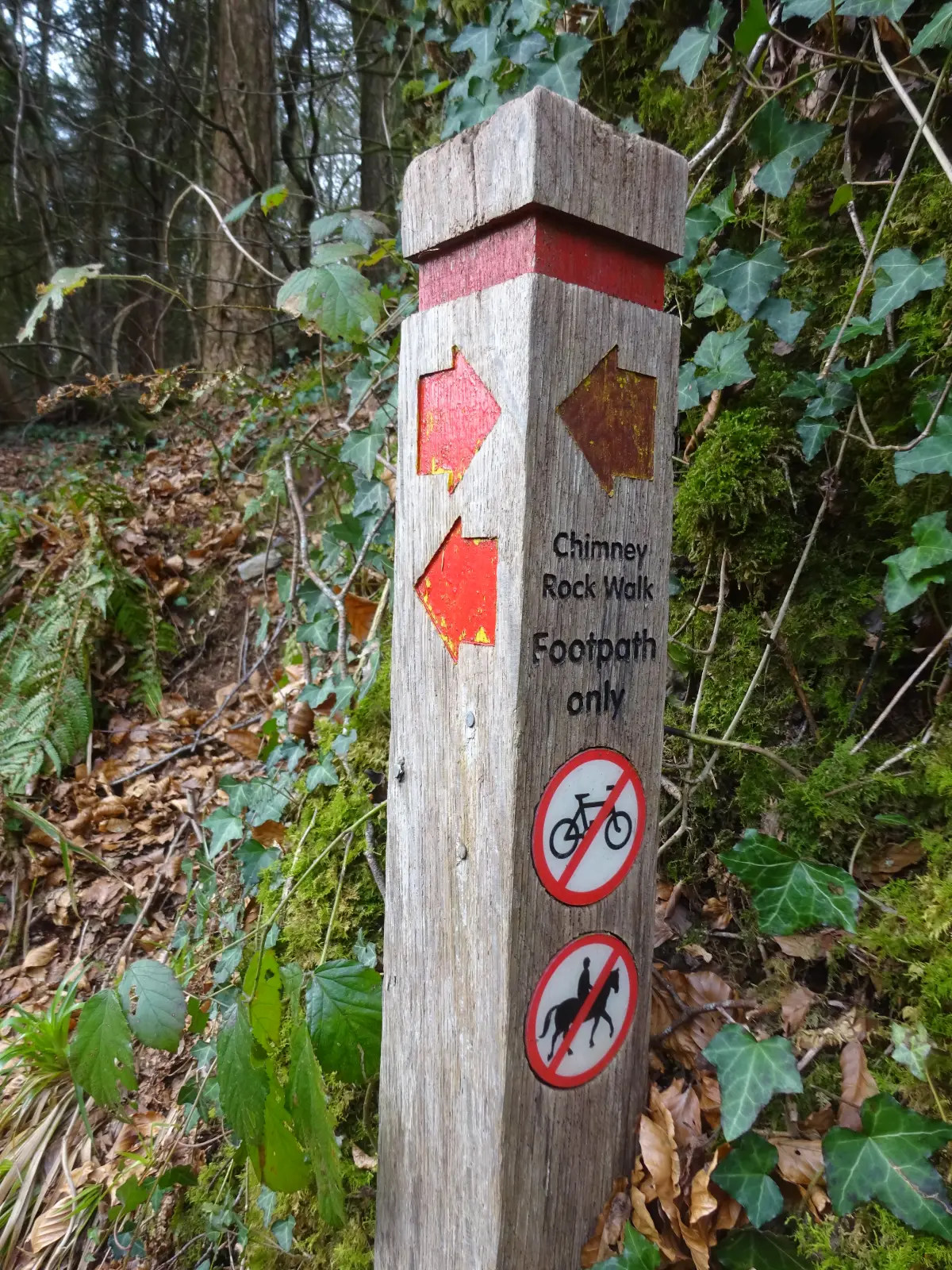 Good woodland tracks; steady climb after Point 4 on long route; narrow and exposed path to Chimney Rock